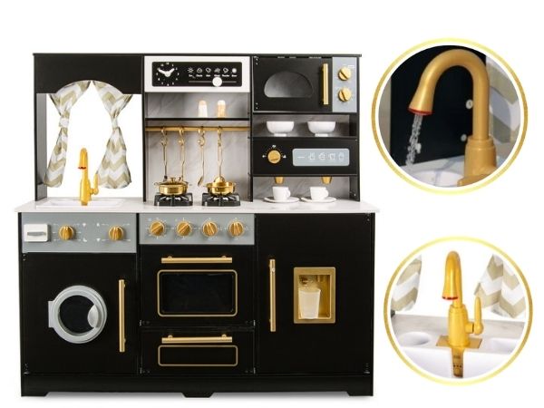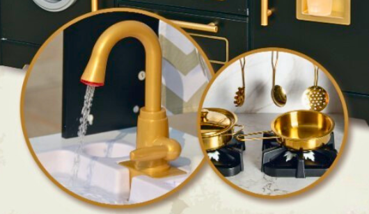 Die Verbindung von Schwarz, Grau, Marmoroptik und goldenen Akzenten verleiht der Küche einen luxuriösen Charakter, der zum Spielen einlädt und ein Highlight im Kinderzimmer darstellt.